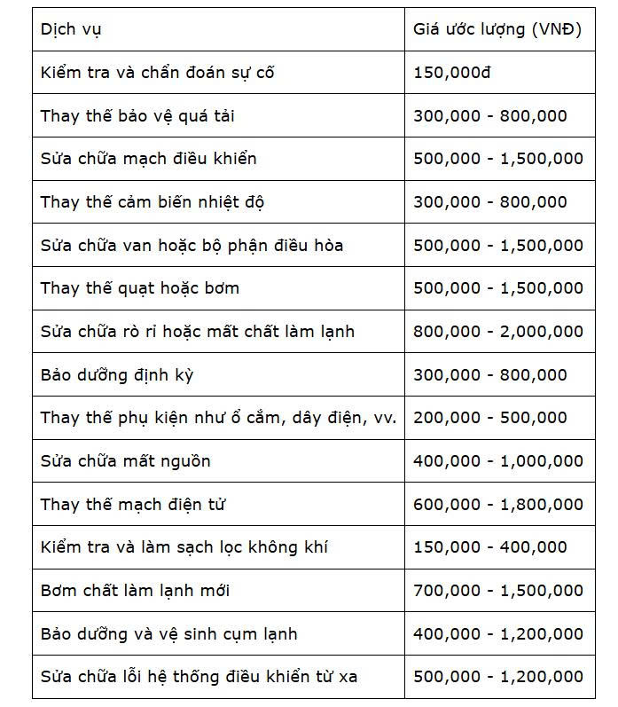 Lưu ý: Bảng giá sửa máy lạnh chỉ mang tính tham khảo, giá cả có thể thay đổi tùy theo biến động của thị trường.